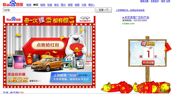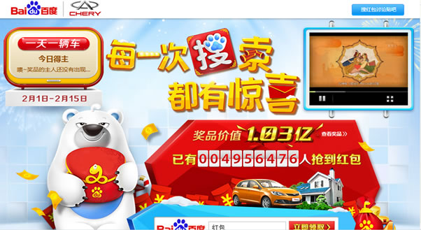 看看上圖,CHERY的標(biāo)志很明顯吧?據(jù)悉,百度的獎品里就有CHERY的汽車喔!當(dāng)然,要參加搜索才能積累拿紅包的分值,用戶還可以通過下載百度的瀏覽器、百度搜索入口以及百度語音助手來參加搜索,手機(jī)搜紅包,不但沒有次數(shù)限制,中獎概率也倍增,看來百度對于移動手機(jī)市場的搜索份額占有也是志在必得呢!