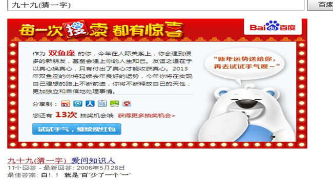 大家看到了嗎?筆者第一次抽到的問題是“何潔的職業(yè)是什么”,第二次抽到的問題是“九十九猜一字”,筆者連續(xù)猜了四次,百度都會用各種方法將答案呈現(xiàn)給我,而得到的紅包卻是一樣的。看來百度的禮物不是那么容易拿得到手的,想要將垂涎三尺的大禮包拿到手,還得再下一番功夫才行。