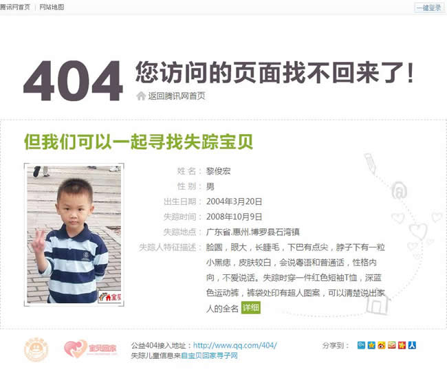 這個還是騰訊,不過除了騰訊之外,一些大型網站如百度等也在使用這種404頁面設計,即用戶因指令錯誤無法到達目標頁面時,頁面直接跳轉到公益頁面,這種404頁面不能算得上創意(當初這種404頁面首先被百度所運用的時候,曾有人撰文指出百度是在抄襲國外網站的做法,此為外話不提),但是還是很多大型網站都會采用。由于這種404頁面是大型網站特別是靠用戶流量吃飯的網站來說,不但“接地氣”,體現了科技公司對弱勢群體的關注,而且又能使自己的404頁面不至于那么單調,一舉兩得。
