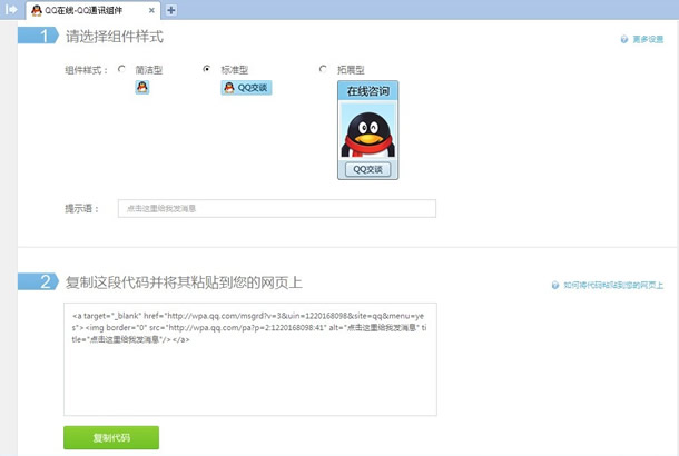3、點(diǎn)擊網(wǎng)站右上方的“QQ通訊組件”按鈕,可以根據(jù)自己的喜好選擇相應(yīng)的QQ在線客戶顯示形式。此步驟需要將代碼復(fù)制黏貼到你的網(wǎng)站代碼中方可啟用。途徑:原網(wǎng)站QQ在線客服代碼==》重新設(shè)置后的QQ在線客戶代碼==》保存生成即可。不熟悉網(wǎng)站代碼的可以請網(wǎng)站建設(shè)公司幫忙設(shè)置。